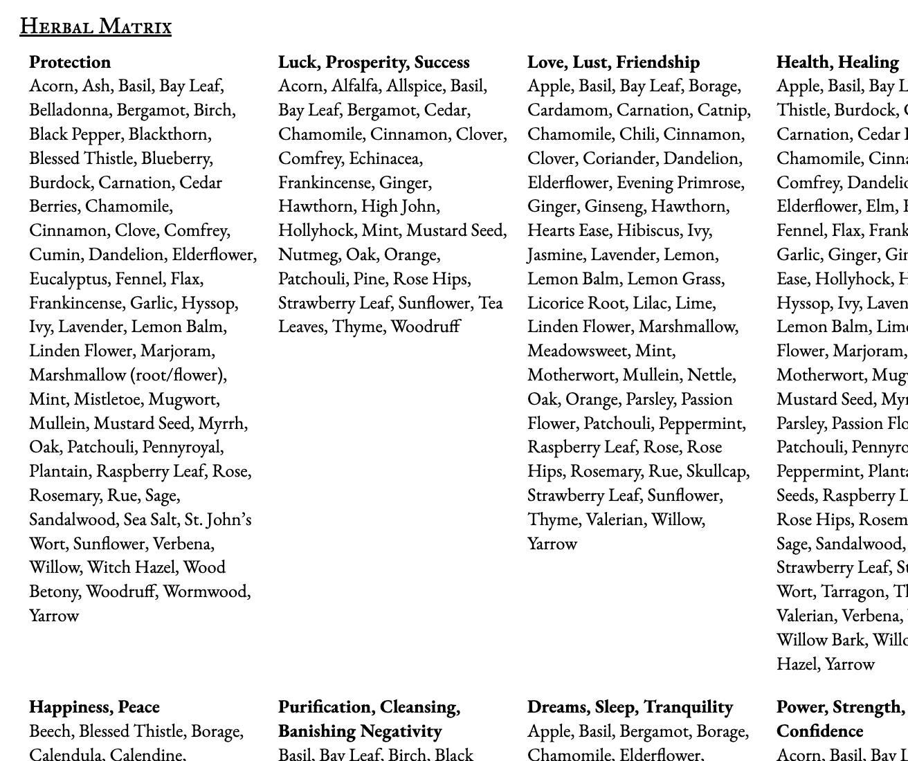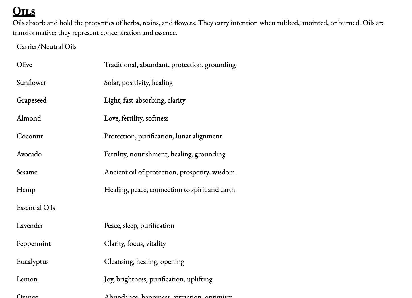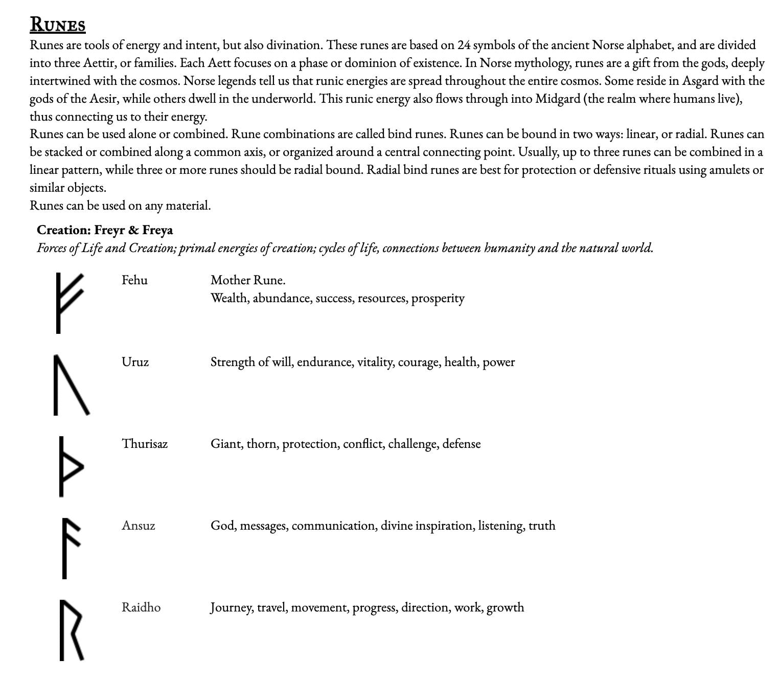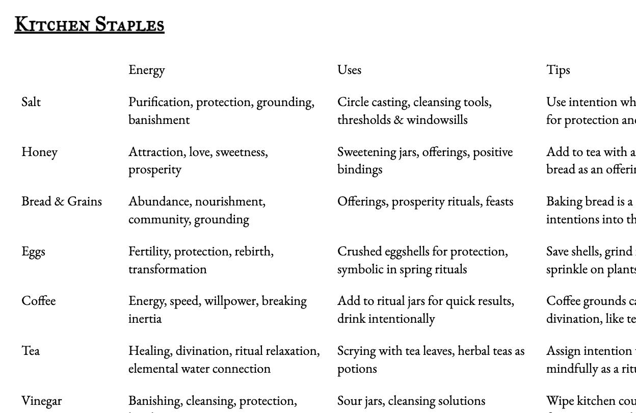 Norse Runes - Herbs - An Herbal Symbolism/Energetic Matrix - Kitchen Staples- Oils - Crystals - Candles - The Moon & The Seasons - Simple kitchen ritual ingredient lists - Sample Affirmations & Petitions - Common Deities