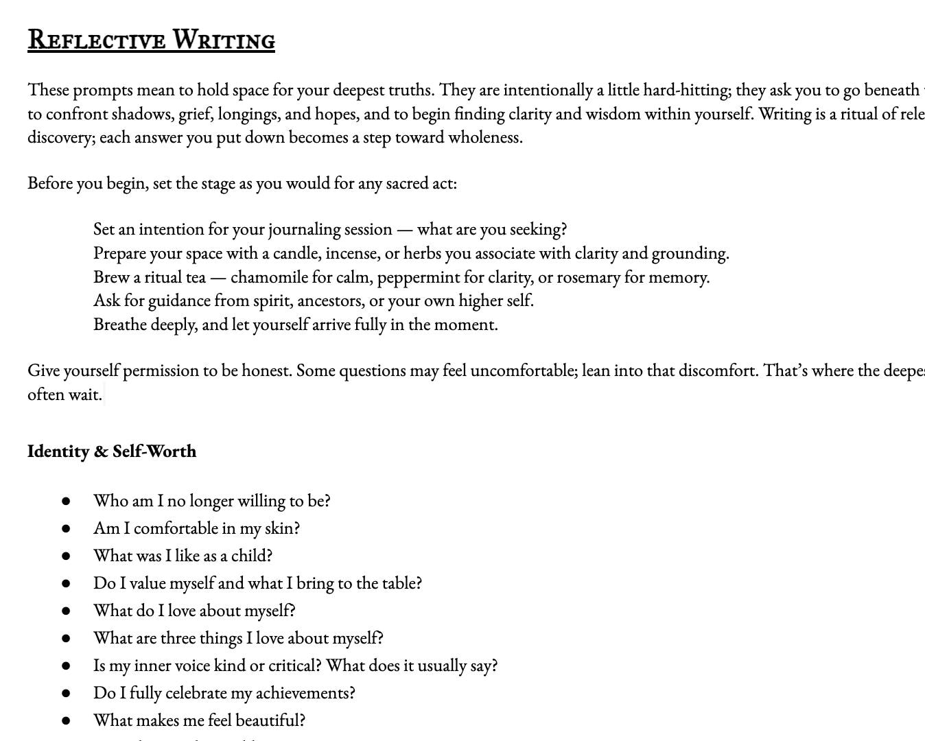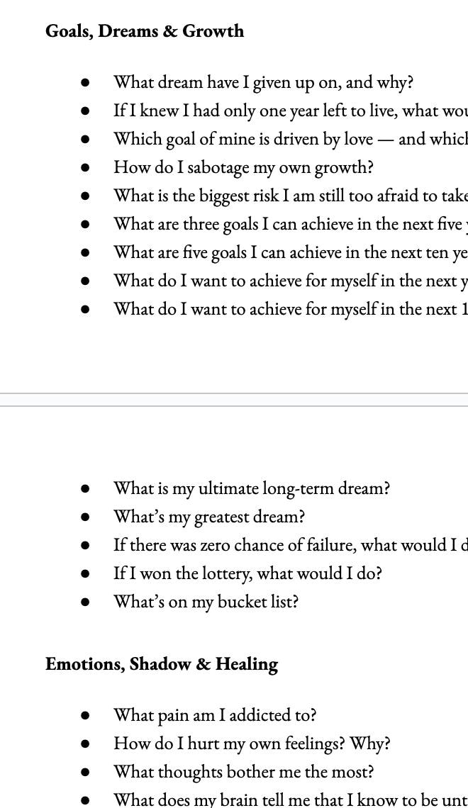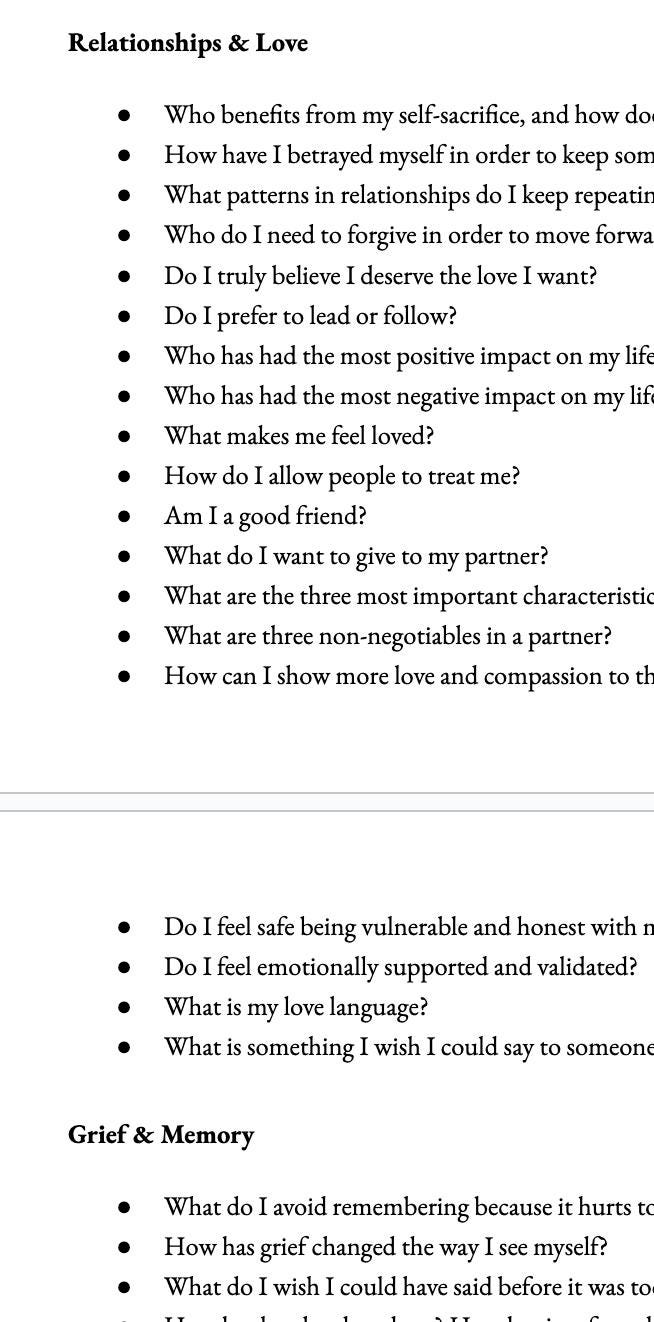 Identity & Self Worth - Goals, Dreams, & Growth - Emotions, Shadow, & Healing - Relationships & Love - Grief & Memory - Sexuality & Intimacy - Daily Life & Self-Care - Spirit, Belief, & Truths